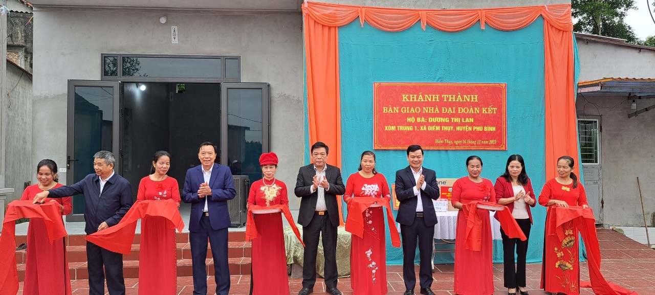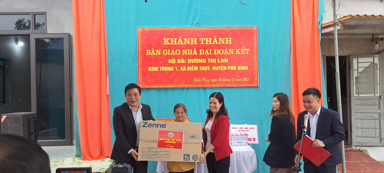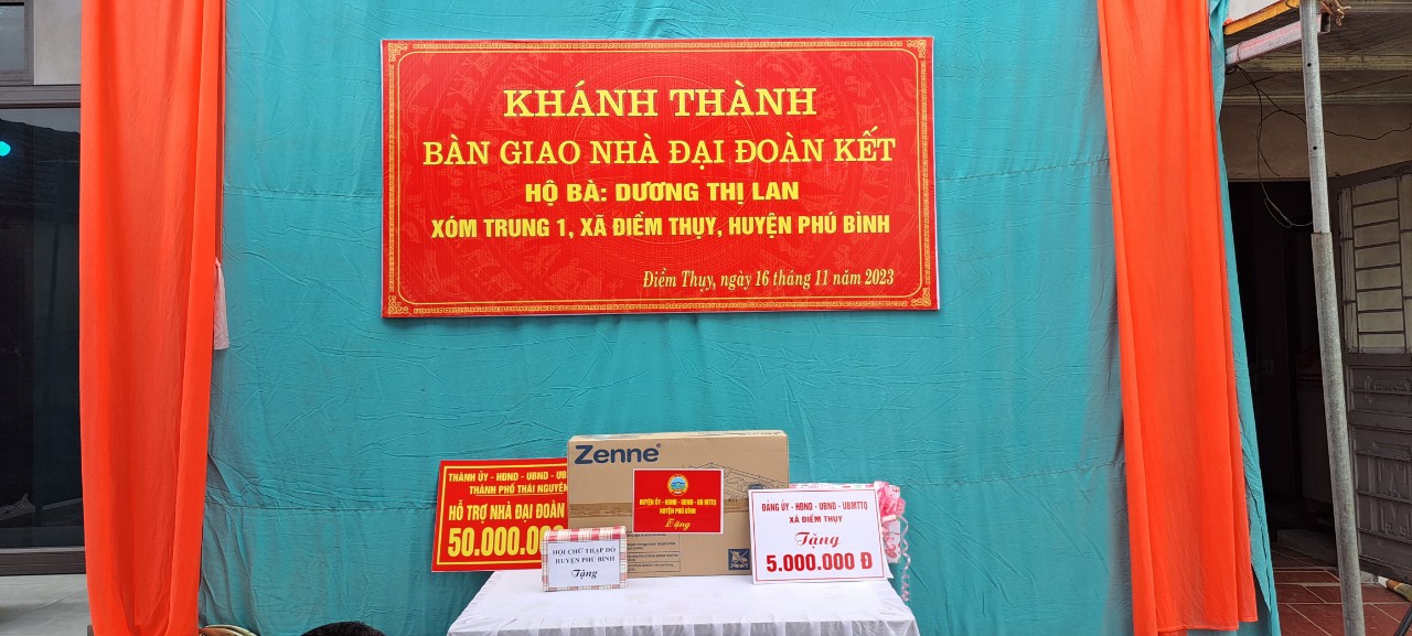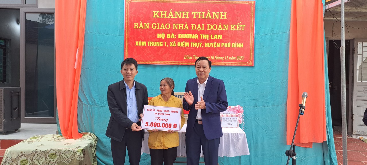 Ngày 16/11/2023 Ủy ban Mặt trận tổ quốc huyện Phú Bình phối hợp với Ủy ban Mặt trận tổ quốc xã Điềm Thụy tổ chức khánh thành và bàn giao nhà Đại đoàn kết cho gia đình bà Dương Thị Lan, xóm Trung 1, xã Điềm Thụy, huyện Phú Bình.
